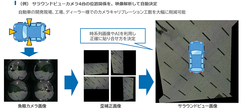 この例では、マルチビューカメラ4台の各撮影画像からカメラの位置関係を推定し、正確に画像を貼り合わせます。AIを使用することで、高精度にカメラの姿勢情報を算出することが可能です。