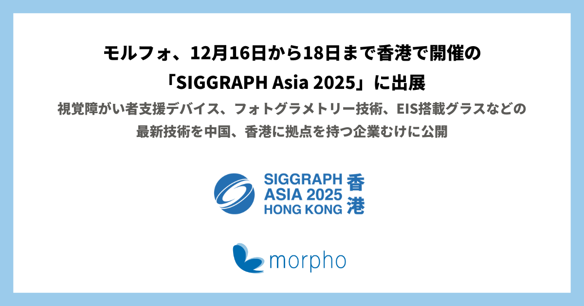 モルフォ、12月16日から18日まで香港で開催の「SIGGRAPH Asia 2025」に出展 投稿日 12月 12, 2025 モルフォ、12月16日から18日まで香港で開催の「SIGGRAPH Asia 2025」に出展 へのコメントはまだありません