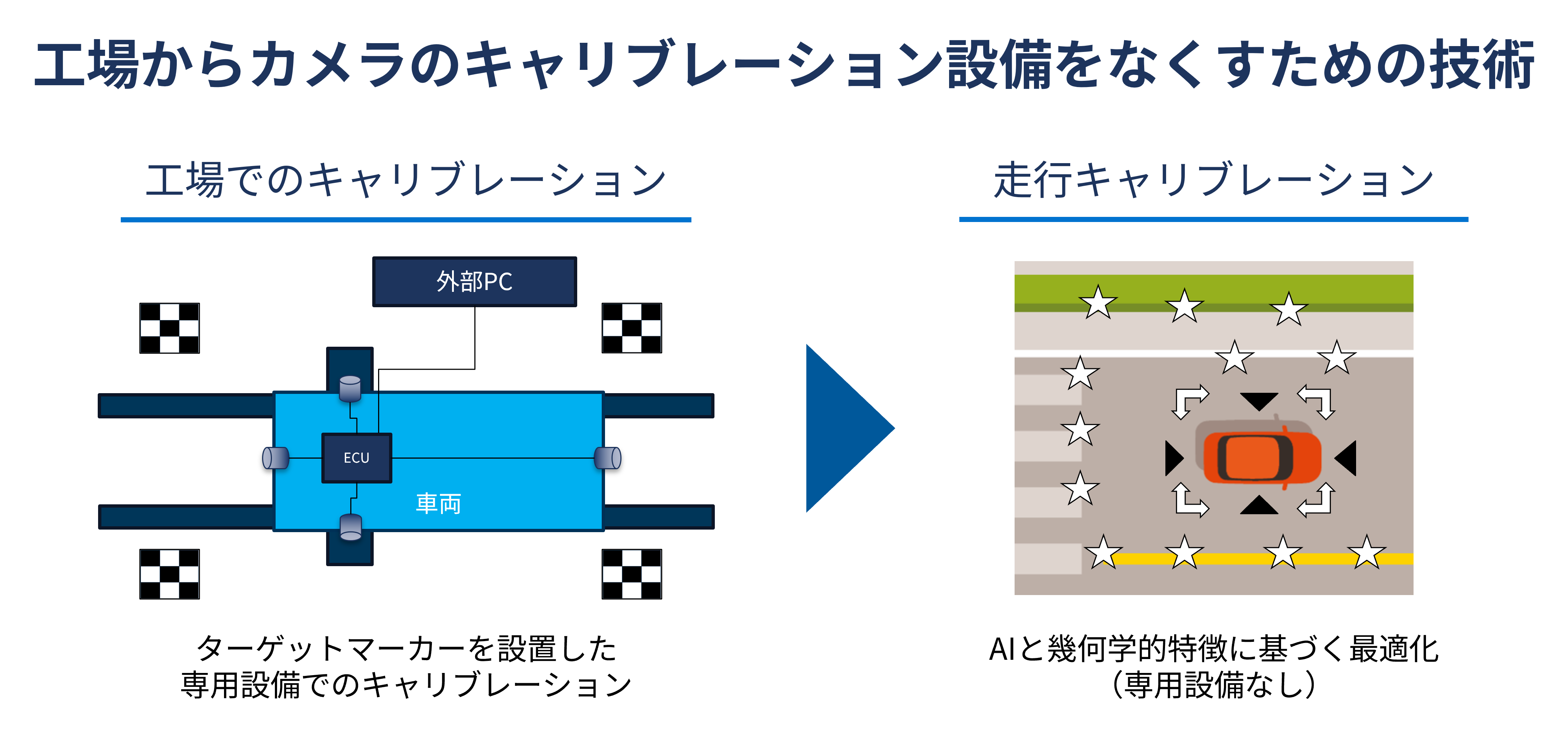 一般的に、自動車の製造工程においてカメラやセンサーを車体に取り付けると、取り付け位置・角度やレンズ性能などに個体差が生じます。その個体差がたとえ数ミリ単位等の微差あっても、後段のソフトウェア処理結果に影響を与える原因となります。そのため、製造時にカメラの数に応じて高精度なカメラキャリブレーションを行い、個体差を吸収する処理が必要となります。しかし、このカメラキャリブレーション向け設備にかかる費用が、カメラやセンサー数の増加に伴い膨大になるという課題があります。
