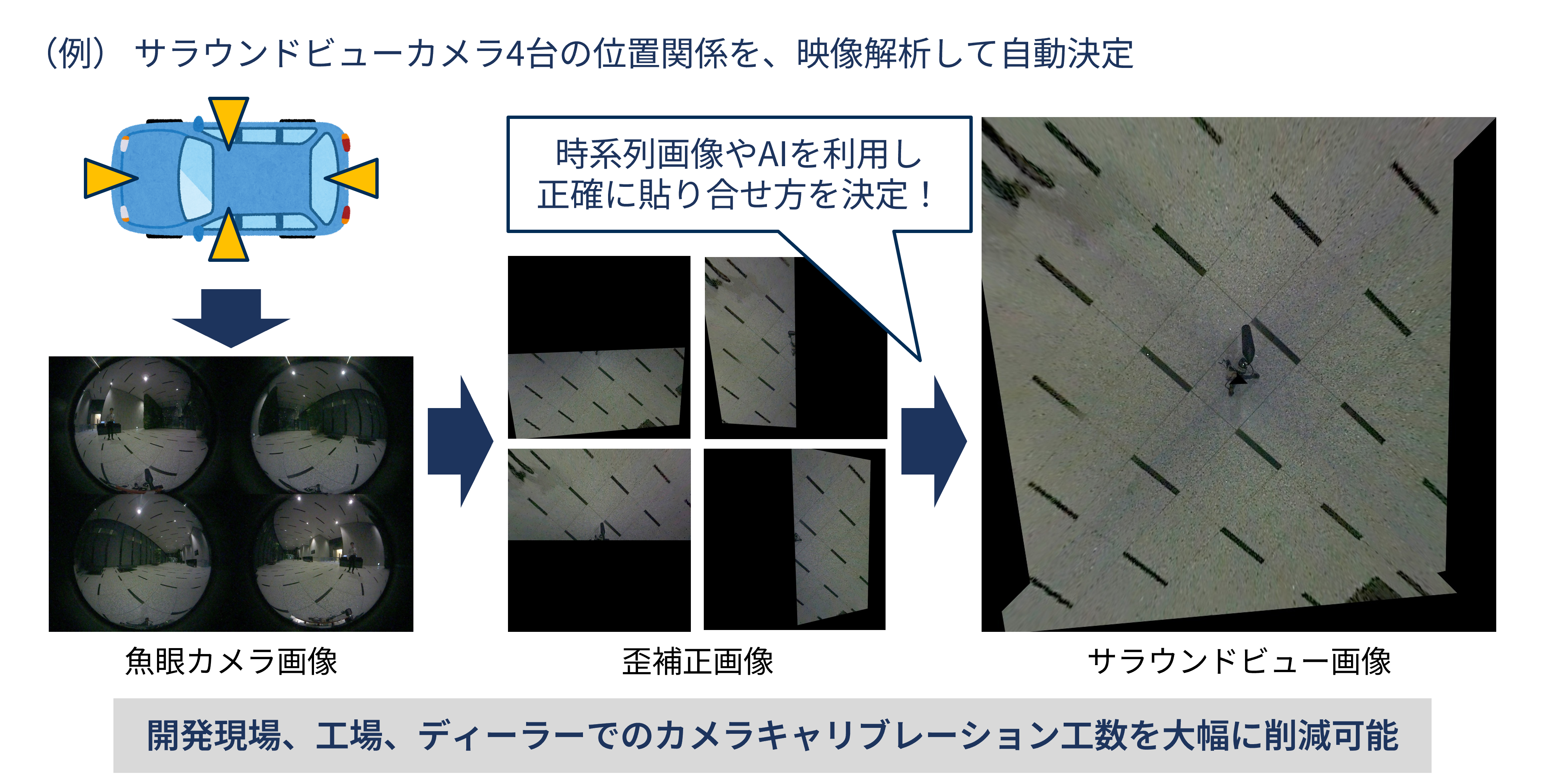 この例では、マルチビューカメラ4台の各撮影画像からカメラの位置関係を推定し、正確に画像を貼り合わせます。AIを使用することで、高精度にカメラの姿勢情報を算出することが可能です。