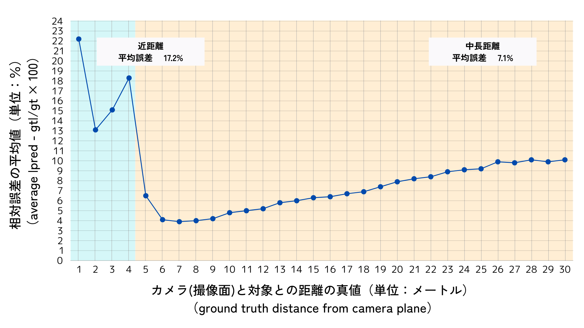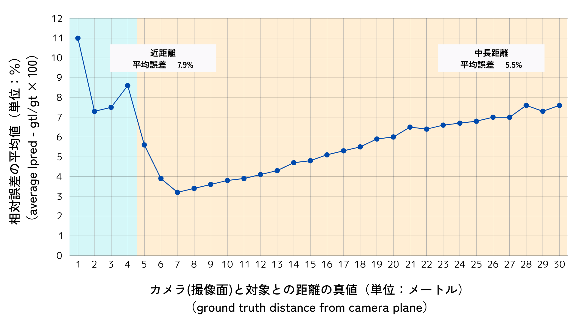 近距離(1-4m)と中長距離(5-30m)、それぞれの距離に対応するデータセットを用いて評価を行いました。以下のグラフは、カメラ撮像面と対象との距離について、真値に対する距離推定の相対誤差の平均値を示しています。